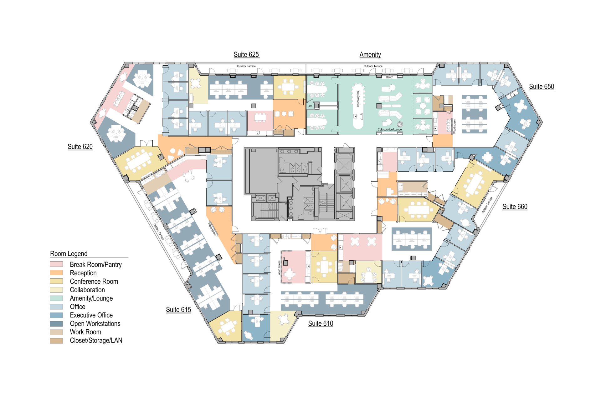 As the individual suites were leased at various points throughout design and into construction, each was customized to the tenants’ unique needs.